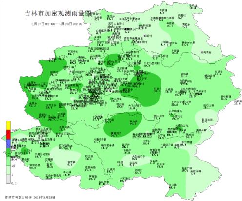 表1:5月27日02时-5月28日08时吉林地区各县市降水总量(单位:毫米)