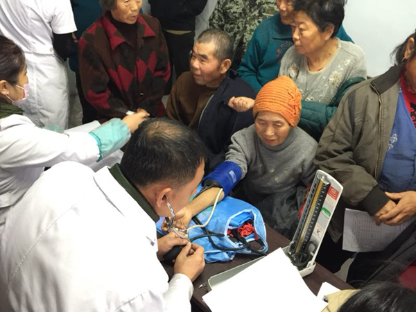 (图为:医护工作者到村入户为困难群众义诊)