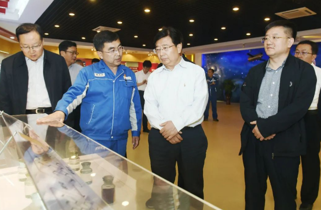 图为洛阳市委副书记、市长徐衣显(右二)在市长王吉(右一)的陪同下在吉林石化公司碳纤维厂实地考察企业生产运营情况