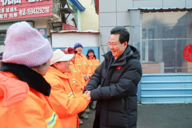 图为市委书记胡斌(右)在船营区保洁处大东清扫队,代表市委、市政府慰问环卫工作者 李显鹏/图