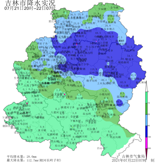 受高空槽东移影响,7月21日20时至7月22日07时,我市出现降雨天气,全市出现大暴雨7站,暴雨52站,大雨32站。全市平均降水量为28.0,其中:蛟河55.3,吉林42.6,舒兰40.7,永吉5.8,桦甸3.0,磐石0.2。