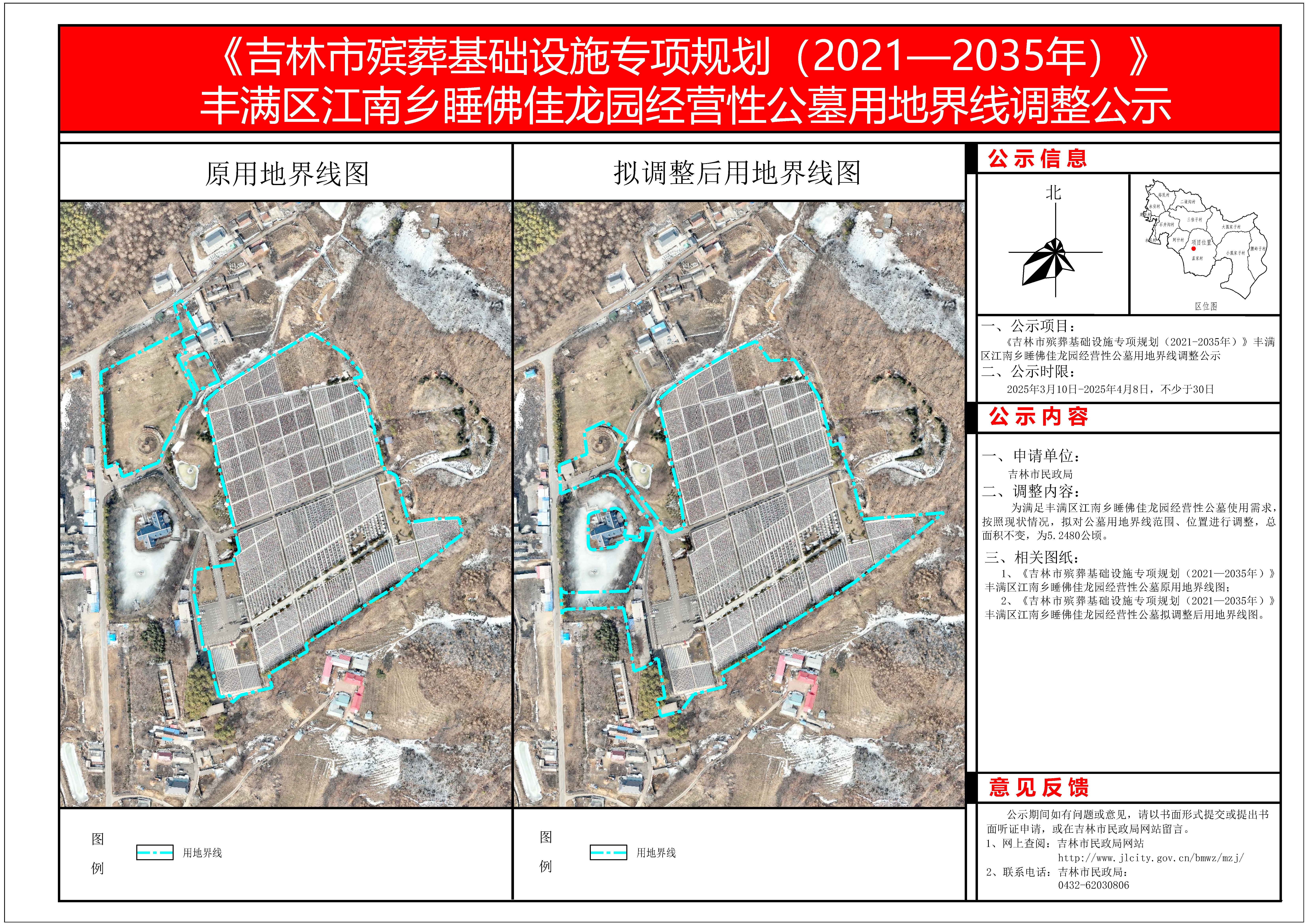 为满足丰满区江南乡睡佛佳龙园经营性公墓使用需求,按照现状情况,拟对公墓用地界线范围、位置进行调整,总体面积不变,为5.248公顷。为进一步提高规划的合理性和可操作性,依法进行公示,欢迎广大市民提出宝贵意见和建议,请提出意见的单位和个人于公示期间,通过电子邮件、传真、信函等形式,将意见反馈至我局。