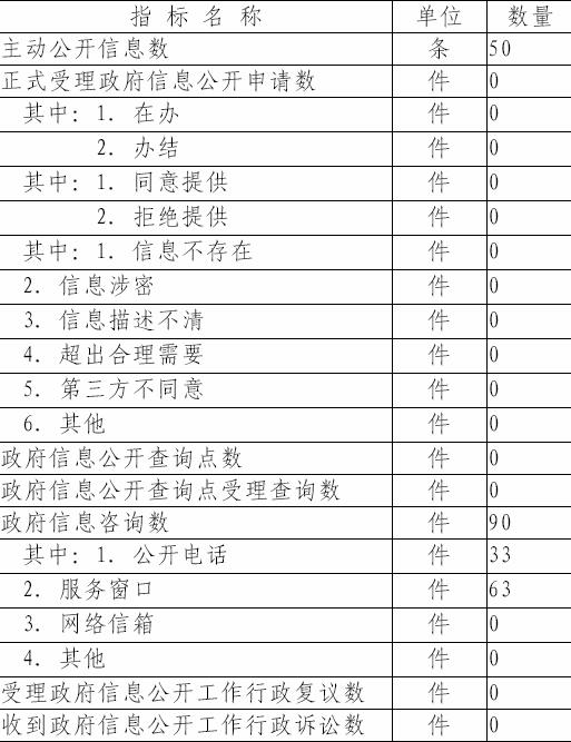 (一) 主动公开信息类别和数量:主动公开政府信息50条,其中, 机构职能5条,占10%;政府决策信息4条,占8%;工作信息6条,占12% ; 发展规划2条,占4%;法律依据19条, 占38%; 工作动态7条,占14%; 工作制度7条,占14%。