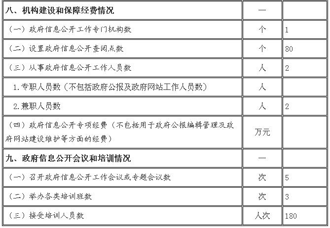 政府信息公开工作专门机构数为1个;设置政府信息公开查阅点数为80;全街从事信息公开工作人员2人,其中,专职人员0人,兼职人员2人,占从事信息公开工作人员数的比例分别为0%、100%;全年举办工作培训5次,参加街、区培训24人次。