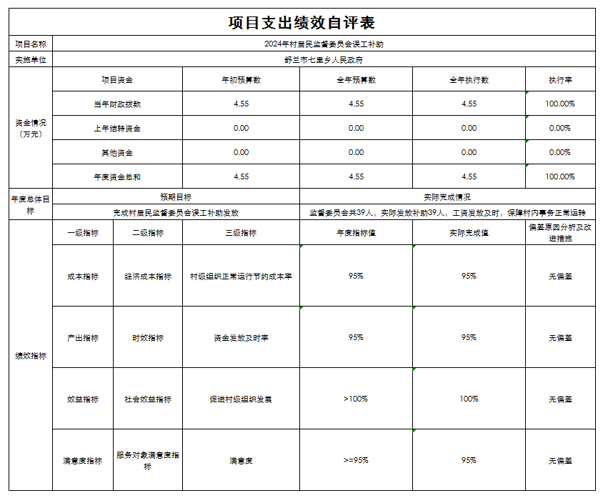 2024年七里乡村居民监督委员会误工补助项目绩效自评情况:根据年初设定的绩效目标,项目绩效自评得分为100分。项目全年预算数为4.55万元,执行数为4.55万元,完成预算的100%。项目绩效目标完成情况:村居民监督委员会补助按时发放;