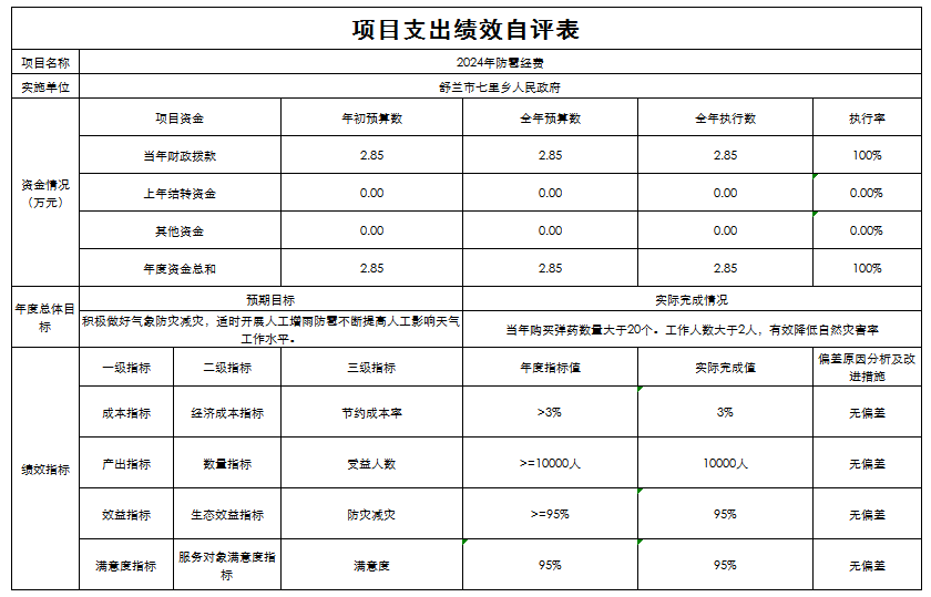 2024年七里乡防雹经费项目绩效自评情况:根据年初设定的绩效目标,项目绩效自评得分为100分。项目全年预算数为2.85万元,执行数为2.85万元,完成预算的100%。项目绩效目标完成情况:气象服务工作正常运行;