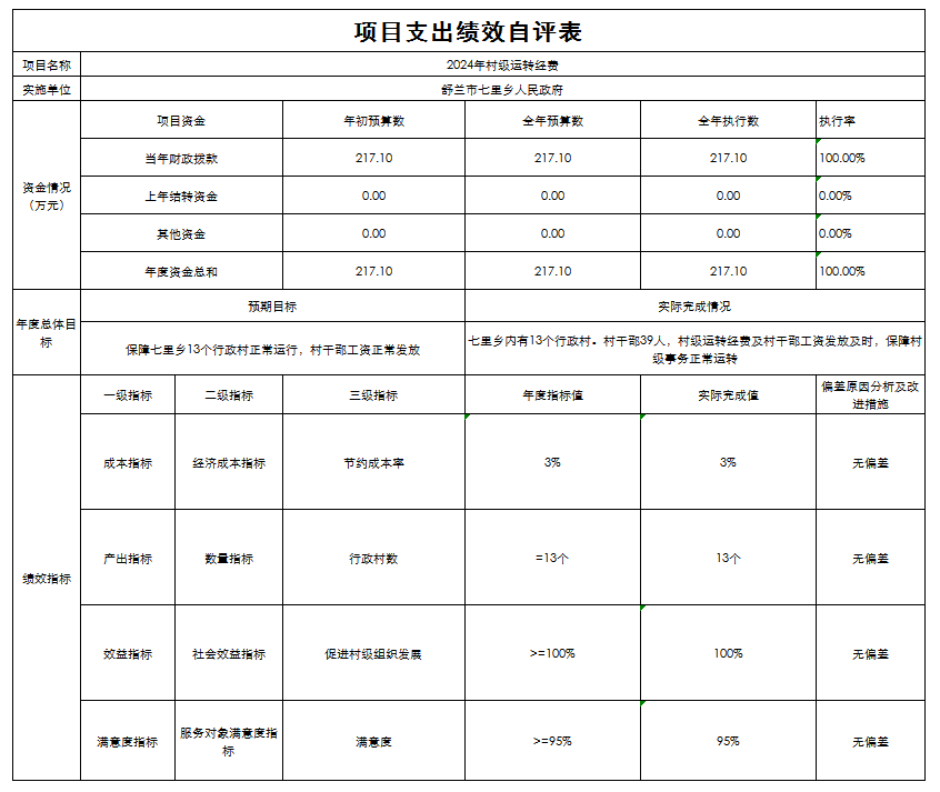 2024年七里乡村级运转项目绩效自评情况:根据年初设定的绩效目标,项目绩效自评得分为100分。项目全年预算数为217.1万元,执行数为217.1万元,完成预算的100%。项目绩效目标完成情况:村干部工资正常发放,村组织正常运转;