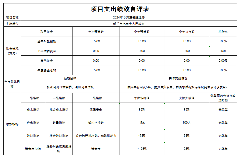 2024年七里乡河道管理经费项目绩效自评情况:根据年初设定的绩效目标,项目绩效自评得分为100分。项目全年预算数为15万元,执行数为15万元,完成预算的100%。项目绩效目标完成情况:保障河道环境良好,减少洪灾发生。