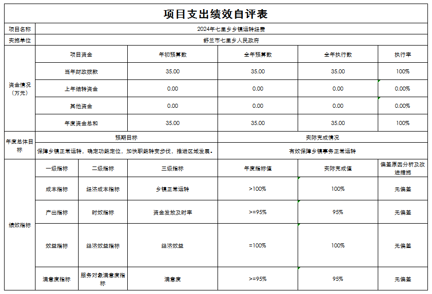 2024年七里乡乡镇运转经费项目绩效自评情况:根据年初设定的绩效目标,项目绩效自评得分为100分。项目全年预算数为35万元,执行数为35万元,完成预算的100%。项目绩效目标完成情况:一是乡镇街运行情况正常运行;二是促进乡镇街发展有所提升;