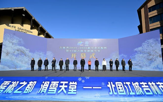11月22日,吉林省2025-2026新雪季开板暨第31届吉林雾凇冰雪节开幕式在吉林市中旅松花湖度假区举行。省委书记黄强出席并宣布新雪季正式开板。省委副书记、省长胡玉亭为“冰雪丝路杯”粉雪联赛开赛授旗。