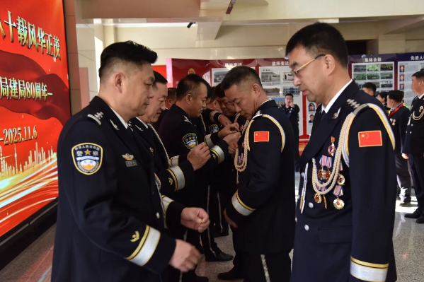 活动中,磐石市局党委班子成员为退休老同志、公安英模、优秀民警和辅警代表佩戴建局八十周年纪念章。这枚小小的纪念章,凝聚着磐石公安八十年来的奉献与荣光,既是对老一辈公安人毕生付出的崇高致敬,更是对忠诚警魂的赓续传承。