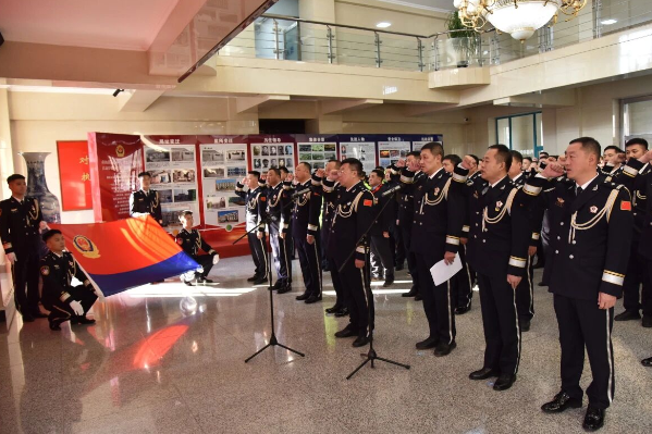 图为磐石市公安局民警面向警旗庄严宣誓现场