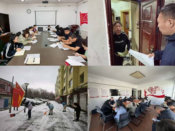 图为工作会议和入户了解民意及清雪现场