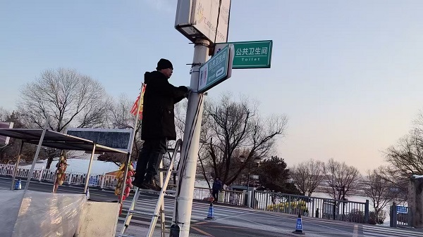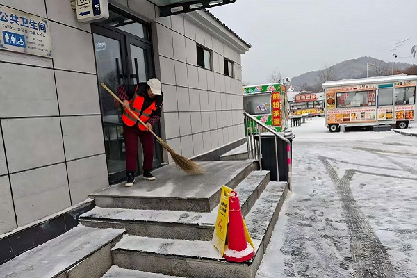 在入冬前后,区住建局周密部署公厕冬季保障工作。全面检修各类设施,累计维修更换易损部件百余件;及时清理公厕周边积雪积冰,铺设防滑垫、设置安全警示牌,保障游客通行安全。通过“专车+专人”模式,确保供水与吸污工作稳定运行,实现公厕24小时开放。此外,在周边道路增设醒目指引标识,有效缓解游客“寻厕难”问题。