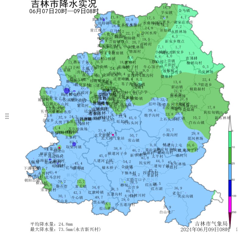受高空槽影响,6月7日20时至6月9日08时全市降水量大于50.0毫米的有10站,25.0~49.9毫米的有96站。全市平均降水量为24.8,其中:桦甸36.6,磐石33.9,永吉28.3,蛟河21.4,吉林20.3,舒兰15.7。