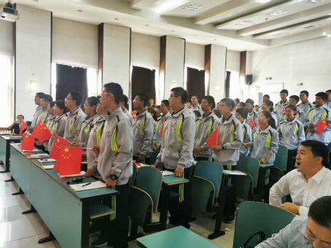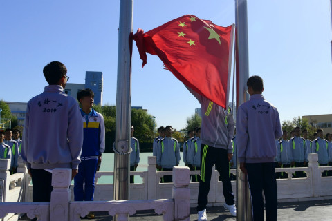 9月23日,市第一中学举行了庆祝中华人民共和国成立70周年“辉煌七十载,华夏共欢腾”主题升旗仪式。校领导、全体教师和全校学生参加了升旗仪式。迎着明媚朝阳,沐着金秋晨风,新生2019级3班同学组成的国旗护卫队,迈着整齐铿锵的步伐到达国旗台下,在全体师生庄重的注目礼中,在校管乐团现场演奏的《国歌》声中,鲜艳的五星红旗冉冉升起,迎风飘扬。校雾凇管乐团演奏的《歌唱祖国》,将现场爱国气氛推向高潮。