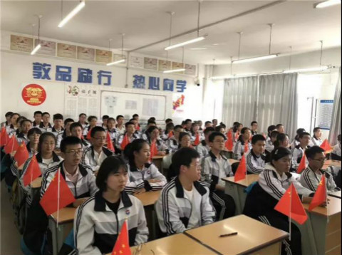 各班在团委、学生处、年级组的带领下,分别组织召开了“庆祝新中国成立70周年”主题班会和德育课,赞美歌颂祖国,抒发爱国情怀。学生们用鲜艳的五星红旗和彩色横幅装饰校园,彰显拳拳爱国之心。漫步一中校园,无处不洋溢着国庆的喜悦。首先映入眼帘的是各班窗口的飘扬五星红旗,教学楼似乎一夜间都换上新装。走入教学楼,墙壁上勉励勤学的标语旁,挂上了鲜艳五星红旗和喜气的红气球。推开教室的门,晨风吹动着每张课桌上的小国旗,金黄的五角星在朝阳下,分外耀眼。
