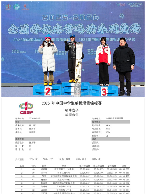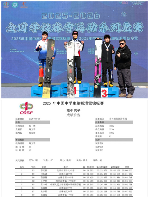 (文图/王新梅 段媛媛)近日,2025—2026 年中国中学生单板滑雪锦标赛圆满落幕。吉林江城中学学子奋勇拼搏、表现优异,在赛事中斩获两项亚军,充分展现了新时代青少年昂扬向上的精神风貌。吉林江城中学2023级4班学生王一可,荣获初中女子组亚军;2025级7班学生付东泽,荣获高中男子组亚军。两位同学凭借扎实的技术和顽强的意志,在全国赛场上为学校获得了荣誉。