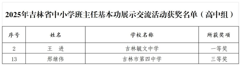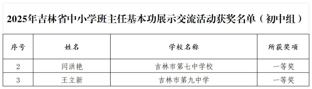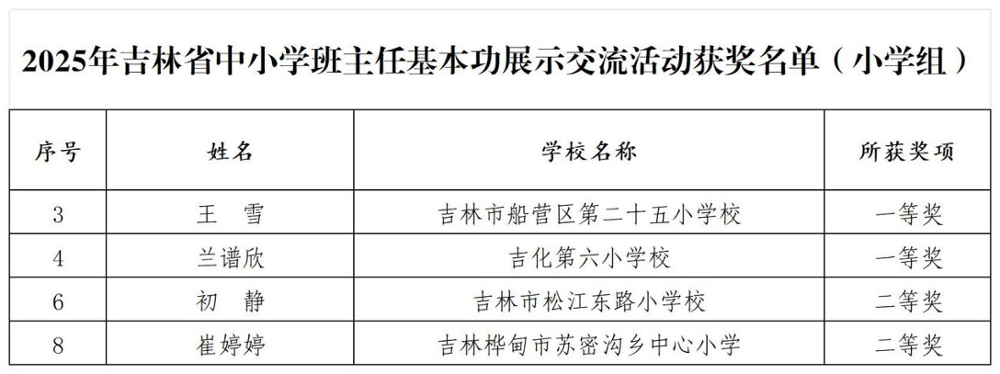 吉林省教育厅发布了《关于公布2025年吉林省中小学班主任基本功展示交流活动结果的公示》,经择优推荐、专家现场评审和资料评审,我市选送的8名优秀班主任全部获奖,取得了一等奖5名、二等奖2名、三等奖1名的优异成绩!