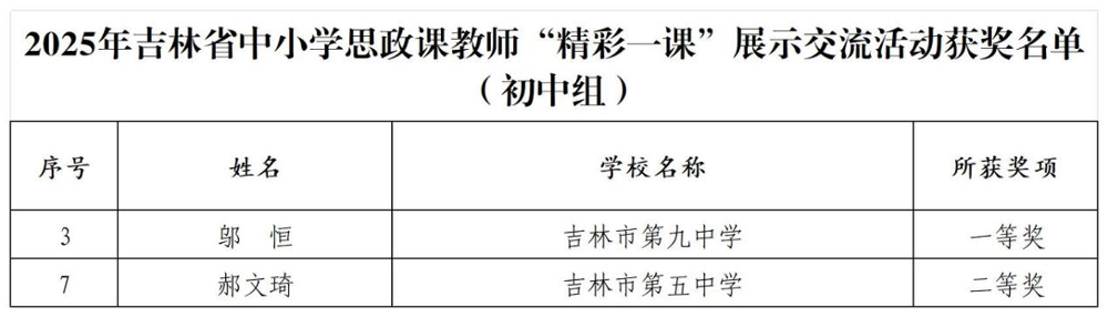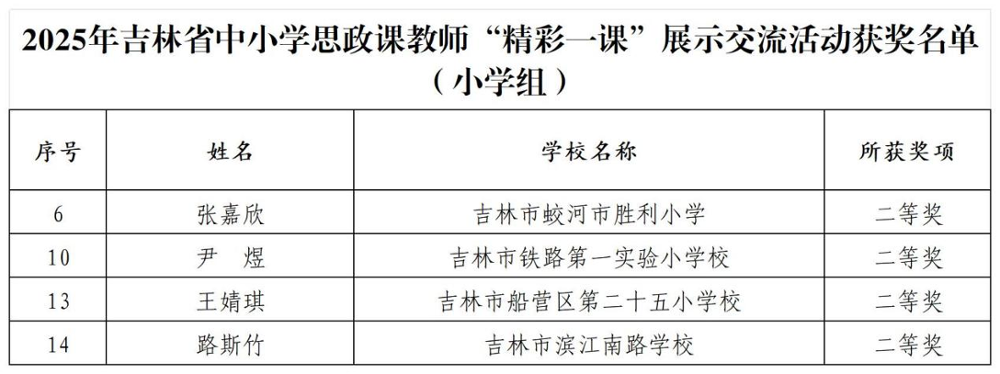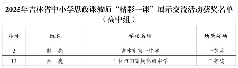 吉林省教育厅发布《关于公布2025年吉林省中小学思政课教师“精彩一课”展示交流活动结果的公示》,我市多位思政课教师凭借精湛的教学设计和富有感染力的课堂呈现,荣获一等奖2名、二等奖5名、三等奖1名的佳绩。