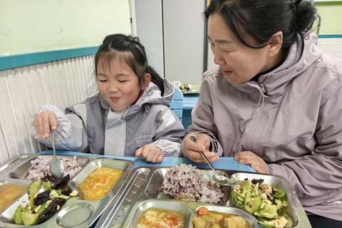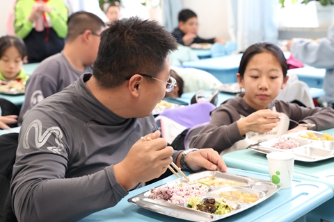 家长代表走进班级与学生同餐共食,亲身体验餐品口感、分量及营养搭配,并与班主任交流学生饮食习惯。
