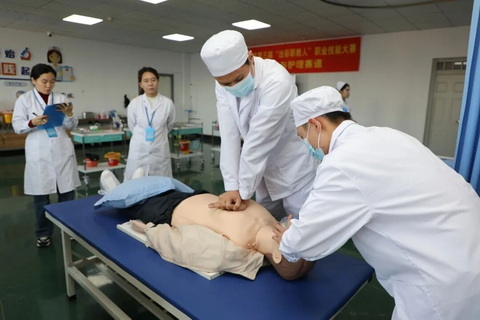 比赛现场,各支队伍精神饱满、沉着应战。康复治疗赛项中,选手们熟练运用关节活动度测量仪、OT桌、PT凳等专业器械,为模拟患者制定个性化康复方案,每一步操作都彰显严谨与专业。护理赛项上,静脉输液、心肺复苏等实操环节紧张有序,选手们动作规范流畅,在限时任务中展现出扎实的护理基本功与应急处置能力,充分诠释了“工匠精神” 的内涵。