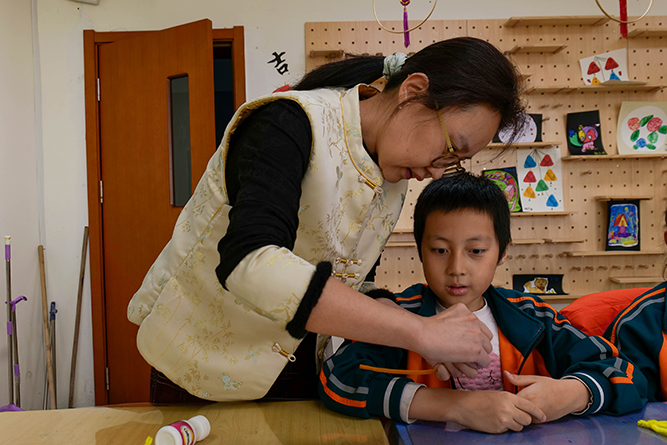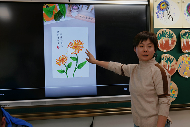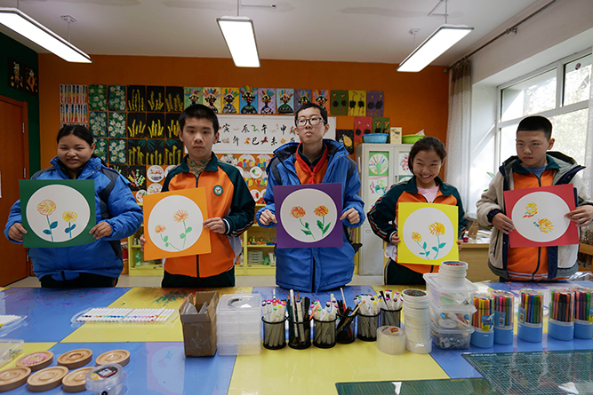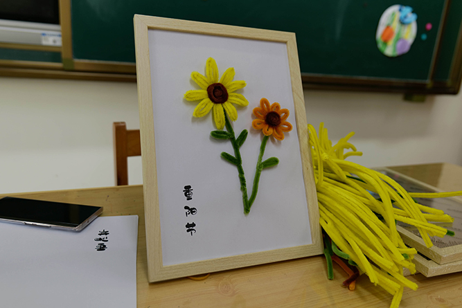 培智班的同学们巧手传情:手工社团用五彩扭扭棒制作出栩栩如生的菊花,创意美术社团用丙烯马克笔描绘秋菊傲霜,儿童画社团则用画笔勾勒出寓意吉祥的茱萸图样。