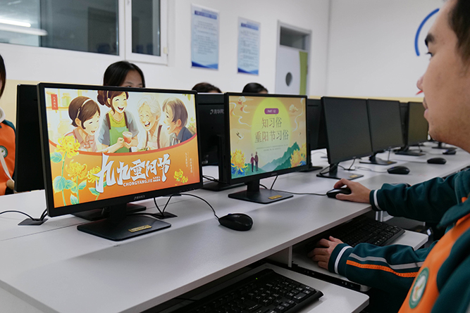 听障班的同学们以画寄情、以技抒意:儿童画社团创作了与奶奶、姥姥的温馨合影,每一笔都饱含深切的爱;微机社团的同学们则用心学习制作重阳节主题PPT,用现代技术传承尊老敬老的传统美德。