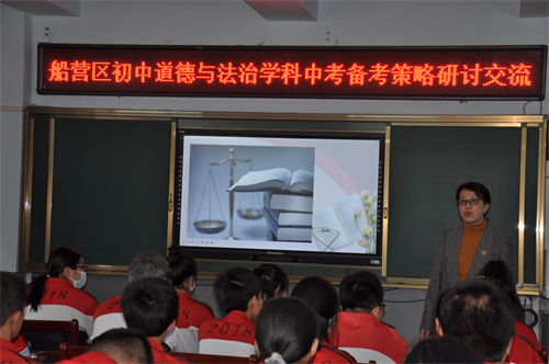 (文图/王英)为全力备战2021年初中道德与法治学科学业水平考试,加强复习备考的针对性和实效性,进一步优化复习策略,提高复习备考质量。2021年5月18日,由船营区教师进修学校主办的 “初中道德与法治学科中考备考策略研讨交流活动”在吉林市第二十五中学校举行。船营区进修学校中学教研培训部道德与法治学科教研员王英老师、吉林市第二十五中学校陈岩副校长及船营区道德与法治学科九年级全体任课教师参加了本次教研活动。