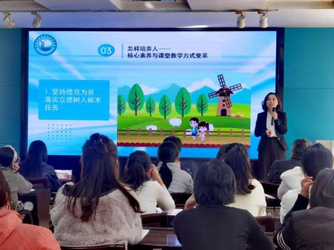 宣讲结束后,培训进入专题讲座环节。昌邑区教师进修学校郭校长以《核心素养导向下的课堂教学意义的思考》为题,围绕核心素养展开系统解读。郭校长从“知识≠本事”的认知突破切入,清晰阐释核心素养并非知识的简单叠加,而是学生适应未来发展的关键能力与必备品格;随后结合“培养社会主义建设者和接班人”的教育方针,点明核心素养培养的重要意义;最后提出以“德育为首”“以学习为中心”的课堂变革路径,为教师将核心素养融入教学提供具体指引。
