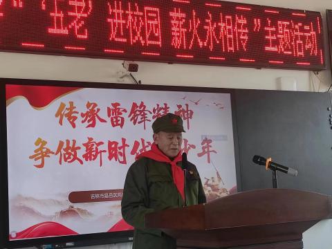 最后,学校负责人董佳壮同志讲话:希望全体少先队员时刻不辜负“五老”人员的期望,把爱国奉献、大公无私的雷锋精神植根于心田,争做有理想、有道德、有文化、有纪律的社会主义事业接班人