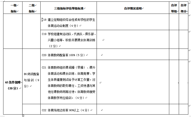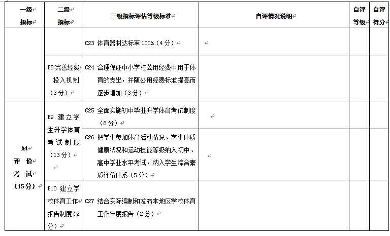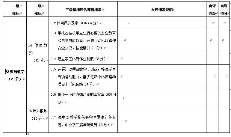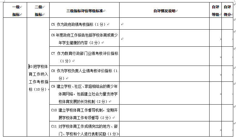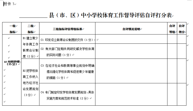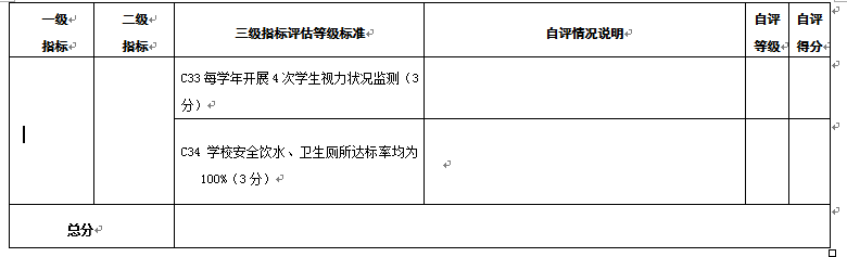 附件1 县(市、区)教育基本情况调查表 项 目 内 容 基本情况 项 目 内 容 基本情况 项目内容 基本情况 自然情况 人口总数 乡(镇)数 教职工编制总数 其中:农业人口数 行政村数 在岗教职工人数 各类教 育情况 小学 学校总数 学生总数 编制数\在岗人数 \ 城镇小学校数 城镇学生数 城镇教职工在岗人数 乡(镇)中心校数 乡(镇)中心校学生数 农村教职工在岗人数 村级小学数\教学点数 村级小学学生数\教学点学生数 初中 学校总数 编制数\在岗人数 \ 城镇初中校数 城镇学校学生数 城镇教职工在岗人数 乡(镇)初中校数 乡(镇)学校学生数 农村教职工在岗人数 普通高中 学校数(含完全中学) 学生总数 编制数\在岗人数 \ 中等职业学校 学校数 学生总数 编制数\在岗人数 \ 幼儿园(班) 园(班)总数 在园(班)儿童数 编制数\在岗人数 \ 乡(镇)园(班)数 乡(镇)在园(班)儿童数 农村教职工在岗人数 附件2 县(市、区)幼儿园办园行为督导评估自评打分表 A级 指标 B级 指标 C级指标 自评情况说明 自评等级 自评得分 A1 办 园 条 件 20分 B1 资质 经费 (4分) C1取得办园许可,证照齐全;按时年检(2分) C2依法筹措办园经费,有必备的办园资金和稳定的经费来源(2分) B2 规模 班额 (3分) C3严格按照规定设置办园规模,一般不超过360人;班额符合规定,每班幼儿人数小班(3至4周岁)25人,中班(4至5周岁)30人,大班(5至6周岁)35人,混合班不超过30人。寄宿制幼儿园每班幼儿人数酌减(3分) B3 园舍与 场地 (4分) C4幼儿园设置在安全区域,无危房,周围没有安全隐患,园舍、户外场地符合《吉林省幼儿园设置标准》;幼儿活动用房不超过三层,每班创设不少于4个类别的幼儿活动区域,配有丰富的游戏设施及游戏材料(4分) B4 设施 设备 (5分) C5幼儿园按相关规定设活动室、寝室、卫生间、保健室、办公室、厨房等生活办公用房,寄宿制幼儿园增设隔离室、浴室和教工值班室等,并达到相应的建设标准(3分) C6教学、生活、安全、卫生等设备设施齐全,符合《吉林省幼儿园设置标准》(2分) B5 玩教具 与图书 (4分) C7公办幼儿园玩教具配备按照国家《幼儿园玩教具配备标准》二类以上标准配备,民办幼儿园按配备标准三类及以上标准配备,并符合国家相关安全质量标准和环保要求。订阅专业杂志10种以上,教师人均藏书20种以上,幼儿人均图书5本以上(4分) A2 安 全 卫 生 20分 B6 安全卫生管理制度 (3分) C8建立安全工作领导机构,配备专职或兼职安全保卫人员,将安全措施落实到岗到人;建立健全卫生保健、门卫、房屋、设备、消防、交通、食品、药物、幼儿接送交接、活动组织和幼儿就寝值守等安全防护和检查制度;建立安全责任制和应急预案(3分) B7 膳食 营养 (4分) C9保障饮水卫生安全,确保幼儿按需饮用温开水;科学制定每周食谱,注重营养均衡,搭配合理,保证幼儿合理膳食;儿童伙食与成人伙食分开(3分) C10每周向家长公示幼儿食谱;按规定进行食品留样(1分) B8 卫生 消毒 (2分) C11建立卫生消毒制度,配备消毒器材;按规定对园舍、场地、玩教具、图书、餐具、生活用品等进行消毒(2分) B9 健康 检查 (3分) C12建立幼儿健康档案,幼儿入园体检率达100%;幼儿园每年体检一次,每半年测身高、视力一次,每季度量体重一次,对幼儿身体健康发展状况定期进行分析、评价,并将体检结果及时向家长反馈(2分) C13幼儿园教职工持健康合格证上岗;每年进行一次健康检查(1分) B10 疾病 防控 (4分) C14严格做好卫生消毒、晨检、午检工作;配合防疫部门做好计划免疫工作(2分) C15做好传染病的检疫、隔离、消毒和上报工作,严格控制发病率;定期对保教人员进行传染病防控工作培训(2分) B11 安全 教育 (2分) C16定期、有针对性地向家长、教职工和幼儿进行安全教育,提高安全意识;掌握基本急救常识和防范、避险、逃生、自救的基本方法,紧急情况下优先保护幼儿的人身安全(1分) C17按规定开展交通安全和消防安全教育以及洪水、地震、火灾等灾害事故的紧急疏散演练,使幼儿了解基本的自我保护方法(1分) B12 校车使 用情况 (2分) C18幼儿园班车使用要符合相关规定要求;加强幼儿园班车驾驶员和车辆的管理,驾驶员和车辆必须经公安部门认定和检验;严格交接班制度及儿童接送制度(2分) A3 保 育 教 育 25分 B13 活动 设计 (5分) C19科学制定幼儿园保育教育工作计划,目标明确,内容具体,措施得当,可操作性强。活动贴近幼儿生活,具有趣味性、活动性和选择性,组织形式灵活恰当,切实提高保教质量(3分) C20教育活动注重引导幼儿的直接感知、实际操作和亲身体验(2分) B14 活动 组织 实施 (16分) C21幼儿一日活动安排科学合理,活动形式多样,动静交替,室内室外活动兼顾;正常情况下,幼儿每天户外活动时间不低于2小时,寄宿制幼儿不得低于3小时(4分) C22坚持以游戏为幼儿的基本活动,教育活动根据需要合理安排,因时、因地、因内容、因材料灵活的运用。充分保证幼儿游戏活动时间,鼓励幼儿自主选择游戏。(4分)。 C23遵循幼儿身心发展特点和规律,注重幼儿良好品质和习惯的养成,面向全体幼儿,关注个别差异,促进幼儿身心全面和谐发展(2分) C24实行保育与教育相结合,健康、语言、社会、科学、艺术各领域教育内容适宜,相互渗透;不提前教授小学教育内容;因人施教,关心幼儿的情绪,开展幼儿心理健康教育,对心理、行为异常等有特殊需要的幼儿提供更多的帮助和