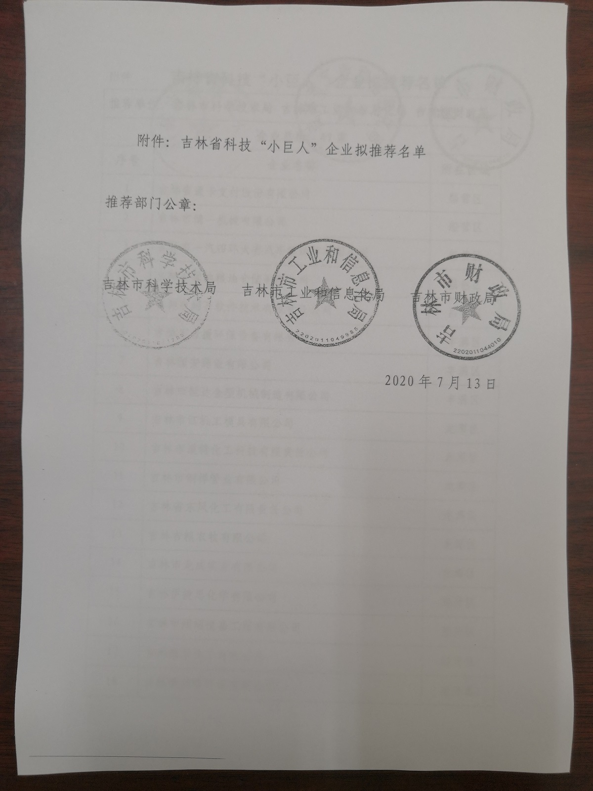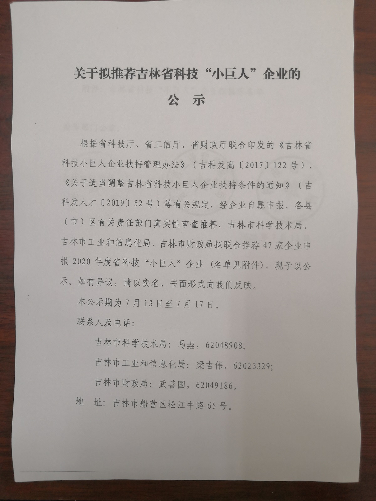 关于拟推荐吉林省科技“小巨人”企业的公示