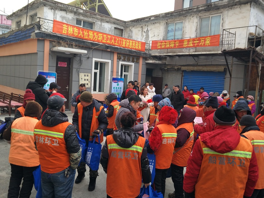 2019年1月28日上午,在中国传统农历小年这天,吉林市人社局信息中心来到了船营区临江清扫队环卫工人休息点,开展“为环卫工人上门宣讲人社惠民政策”活动,给工作在一线的环卫工人送来了冬日的祝福及温暖,市人社局信息中心和市环卫处、船营区环卫处参加了这次活动。