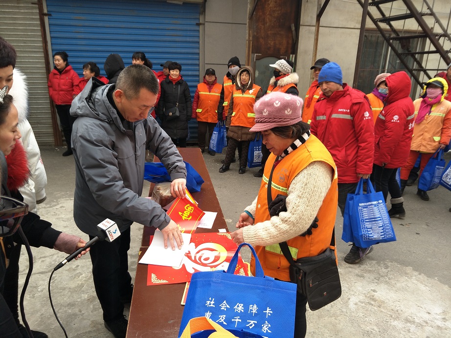 上图为市人社局信息中心副主任左奇为环卫工人发放春联福字