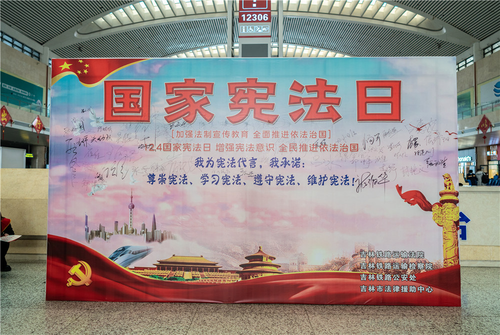 为贯彻落实“深入学习宣传习近平法治思想 大力弘扬宪法精神”的主题精神,在第7个国家宪法日来临之际,吉林市法律援助中心联合吉林铁路运输法院、吉林铁路运输检察院、吉林铁路公安处在市火车站共同开展“12.4”国家宪法日签名活动。
