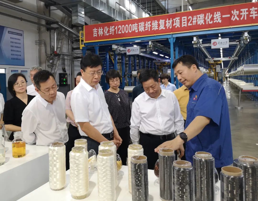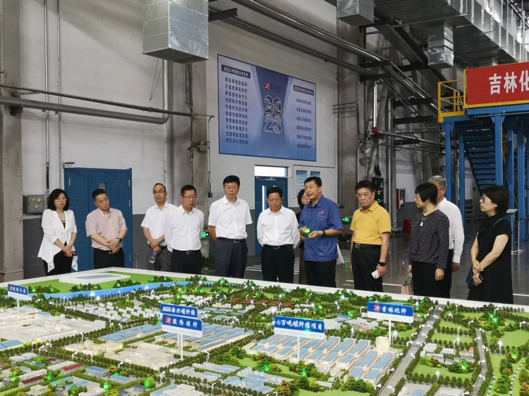 刘豫峰一行参观了化纤集团国兴碳纤维有限公司6万吨碳纤维、凯美克公司1.2万吨碳纤维项目现场,以及吉研高科公司生产现场,听取了企业负责人对项目建设与生产情况的介绍。