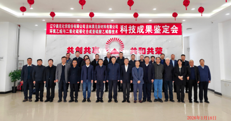 2026年1月18日上午,由辽宁奥克化学股份有限公司和吉林奥克新材料有限公司联合开发完成的环氧乙烷与二氧化硫催化合成锂电池添加剂亚硫酸乙烯酯技术在吉林市顺利通过了中国石油和化学工业联合会组织的科技成果鉴定。
