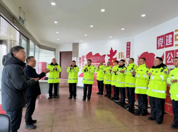 在交警经开中队,简俊峰表示经开区作为化工园区,交通管理的难度大、风险高、压力重,感谢大家一年来的辛苦付出,祝愿大家在工作和事业上一马当先,攻坚克难。在生活上,龙马精神,阖家幸福。