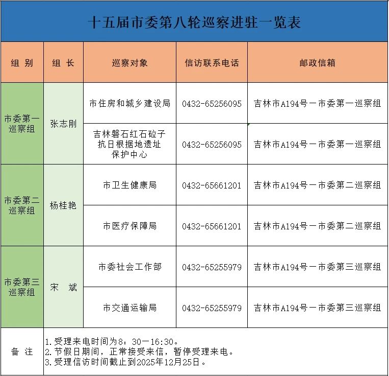 据悉,各巡察组将在被巡察部门(单位)工作2个半月左右,期间设立信访联系电话和邮政信箱,主要受理反映被巡察党组织领导班子及其成员、下一级党组织主要负责人和重点岗位人员问题的来信来电来访,重点是关于违反政治纪律、组织纪律、廉洁纪律、群众纪律、工作纪律和生活纪律等方面问题反映。巡察组受理信访时间截止到2025年12月25日。