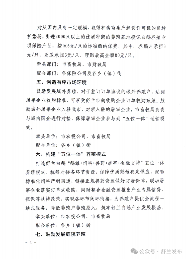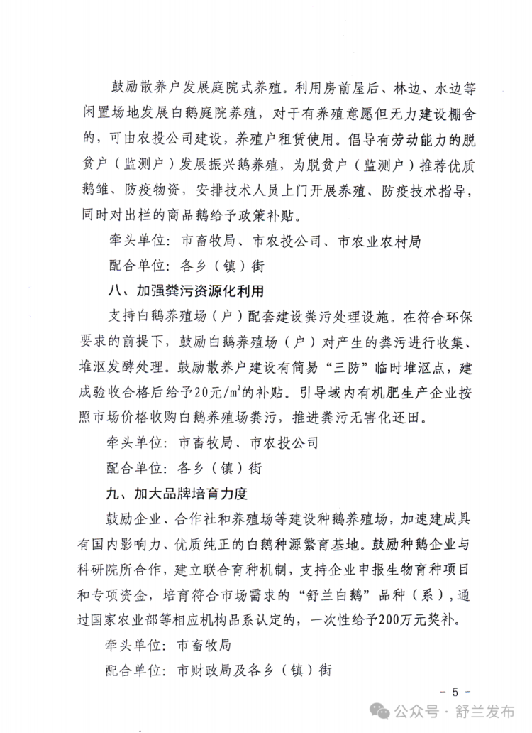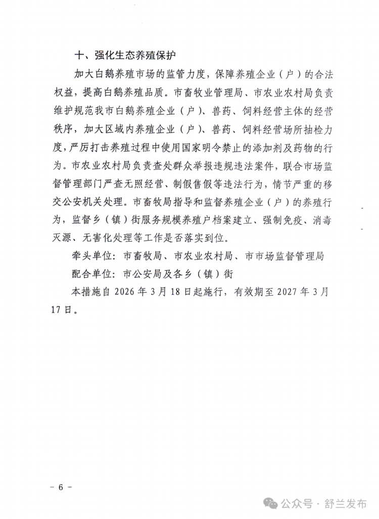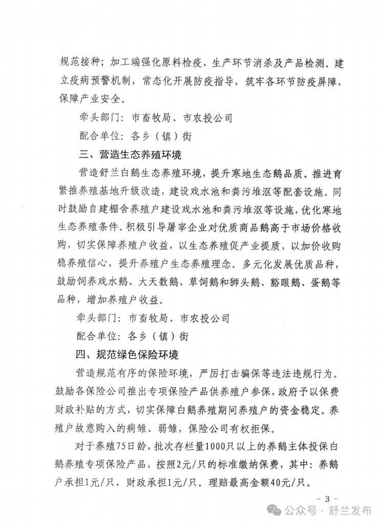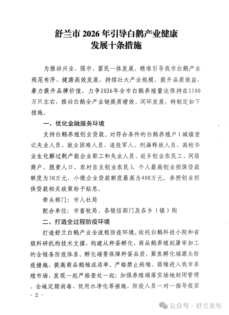 近日,舒兰市印发《2026年引导白鹅产业健康发展十条措施》,围绕“稳规模、提品质、强链条、增收益”系统布局,为养殖主体算清成本账、风险账和收益账,释放出加快做强白鹅产业的信心。