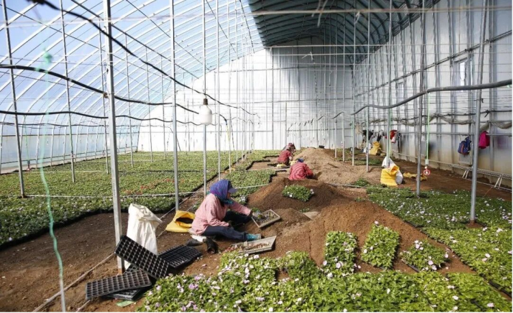 4月8日,舒兰市环城街道兴山村花卉大棚内花香怡人,工人们忙碌着取花、换盆、添土,将移栽好的花卉码放整齐,为集中上市做好准备。