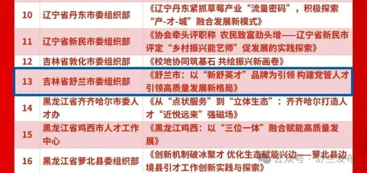 日前,由中国人才杂志社主办的“2025年(第七届)全国人才工作创新案例征集评选活动”结果揭晓,舒兰市委组织部申报的《舒兰市:以“新舒英才”品牌为引领 构建党管人才引领高质量发展新格局》荣获优秀案例。