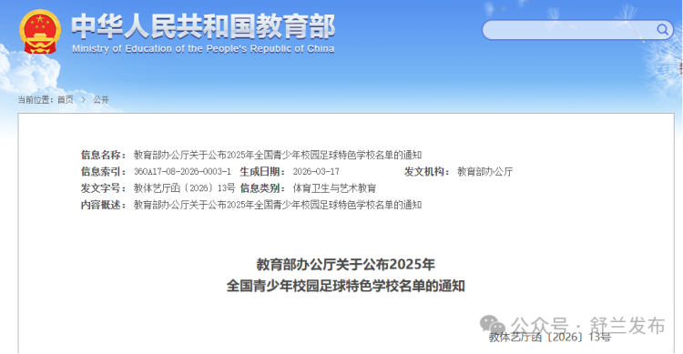 近日,教育部公布2025年全国青少年校园足球特色学校名单,舒兰市第四小学校、第三中学校成功入选。