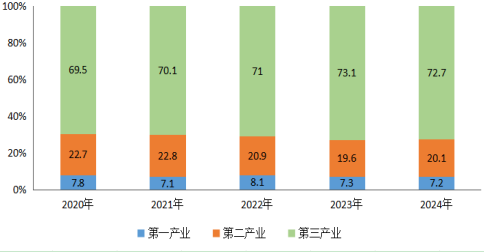 初步核算,全年全区实现地区生产总值87.1亿元,比上年增长4.5%。其中,第一产业增加值6.2亿元,增长4.5%;第二产业增加值17.6亿元,增长5.7%;第三产业增加值63.3亿元,增长4.1%。三次产业结构的比例关系由上年的7.4:18.5:74.1调整为7.2:20.1:72.7。