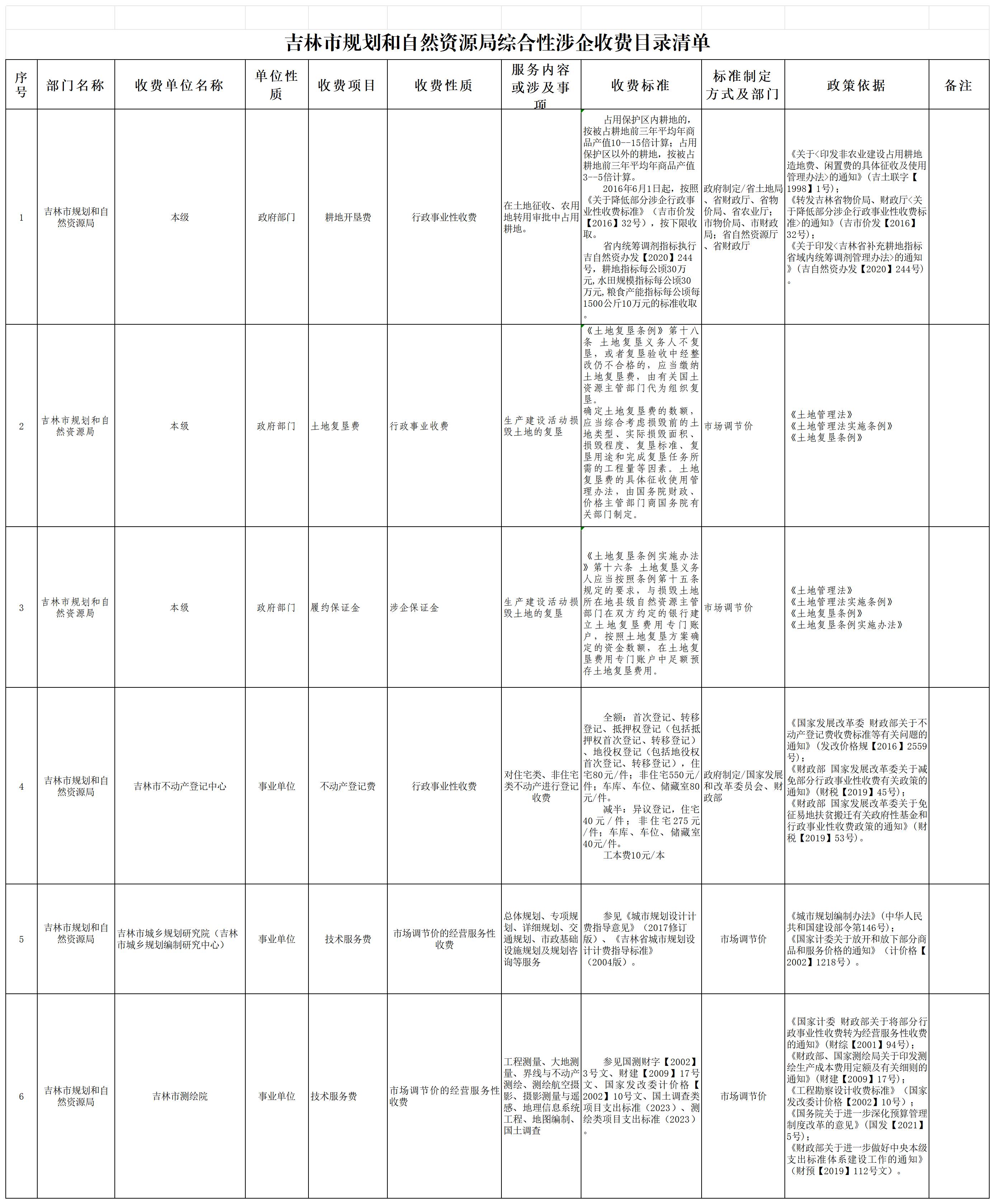 吉林市规划和自然资源局综合性涉企收费目录清单