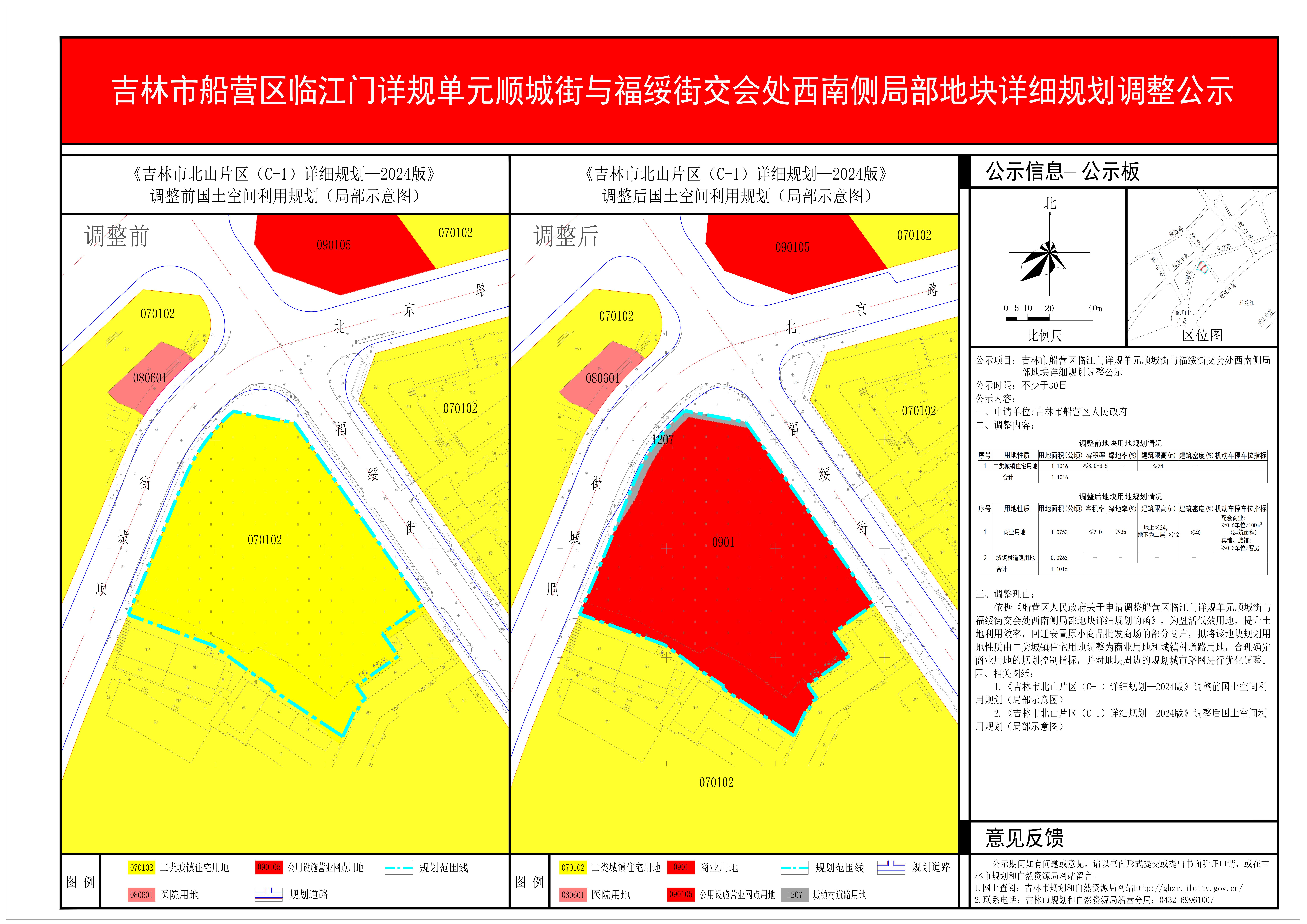 由船营区政府提出申请,我局拟对船营区临江门详规单元顺城街与福绥街交会处西南侧局部地块的详细规划进行调整。根据《中华人民共和国城乡规划法》的相关规定,定于2025年9月27日至10月26日,对上述地块的规划调整方案进行公示,公示期为30天。
