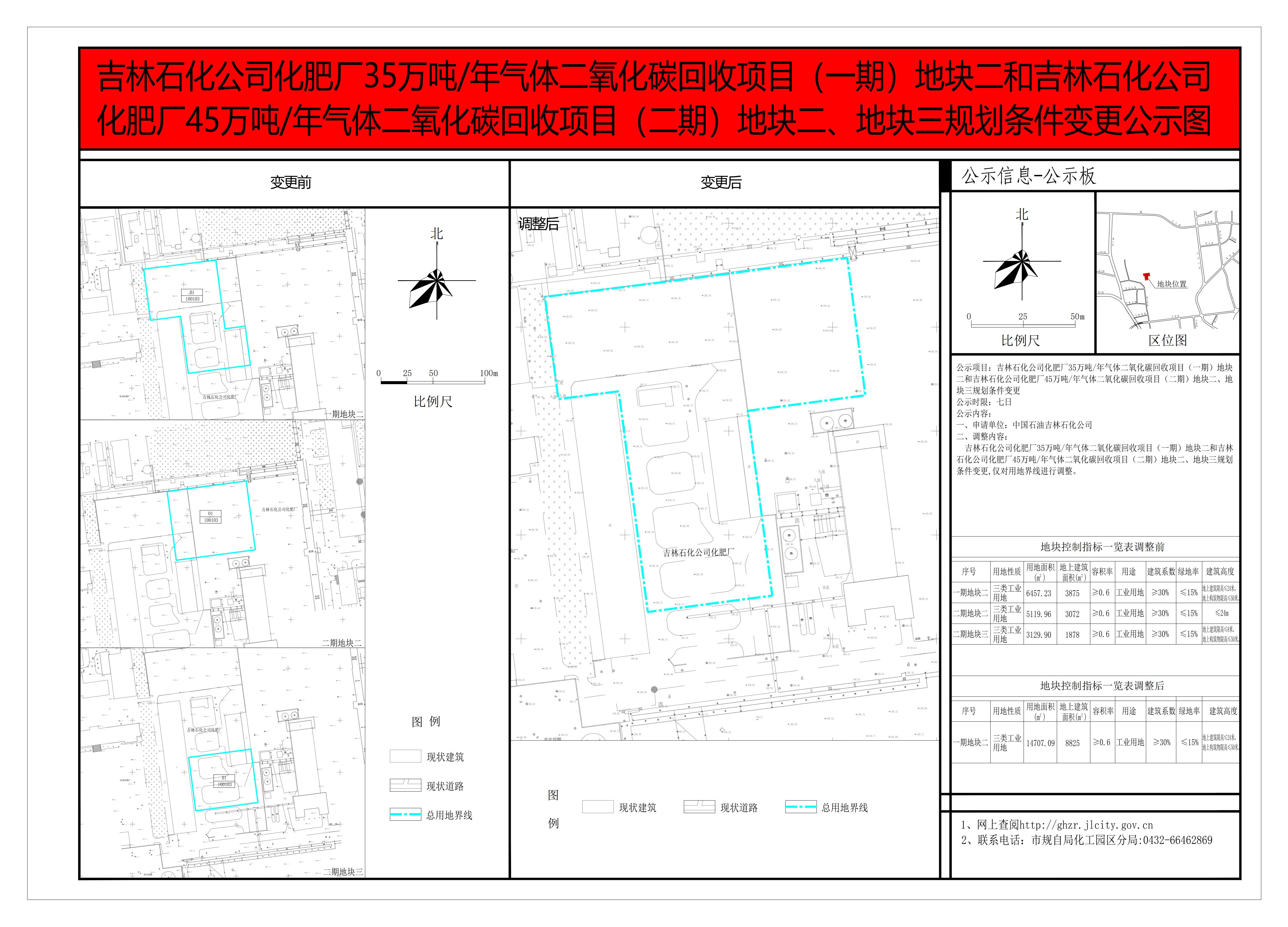 吉林石化公司化肥厂35万吨/年气体二氧化碳回收项目(一期)地块二和吉林石化公司化肥厂45万吨/年气体二氧化碳回收项目(二期)地块二、地块三规划条件变更 |