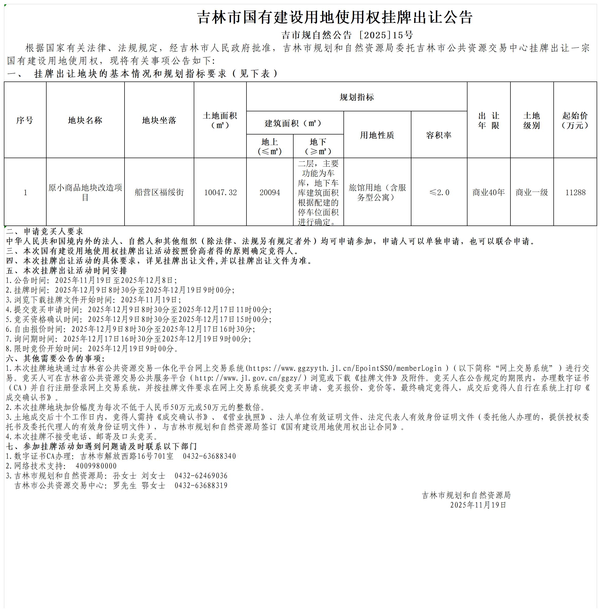 吉林市国有建设用地使用权挂牌出让公告(吉市规自然公告 [2025]15号)