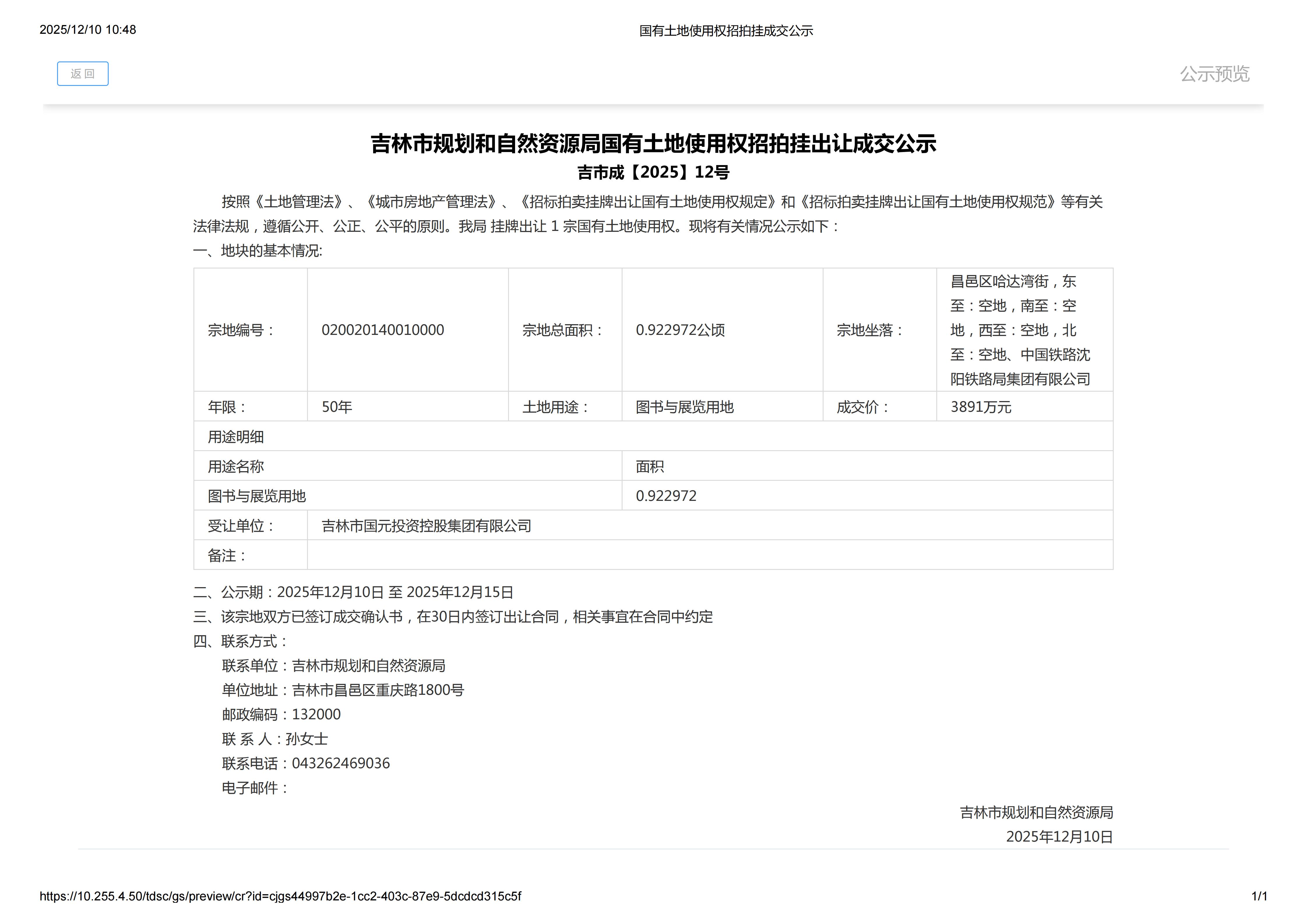 吉林市规划和自然资源局国有土地使用权招拍挂出让成交公示(吉市成【2025】12号)